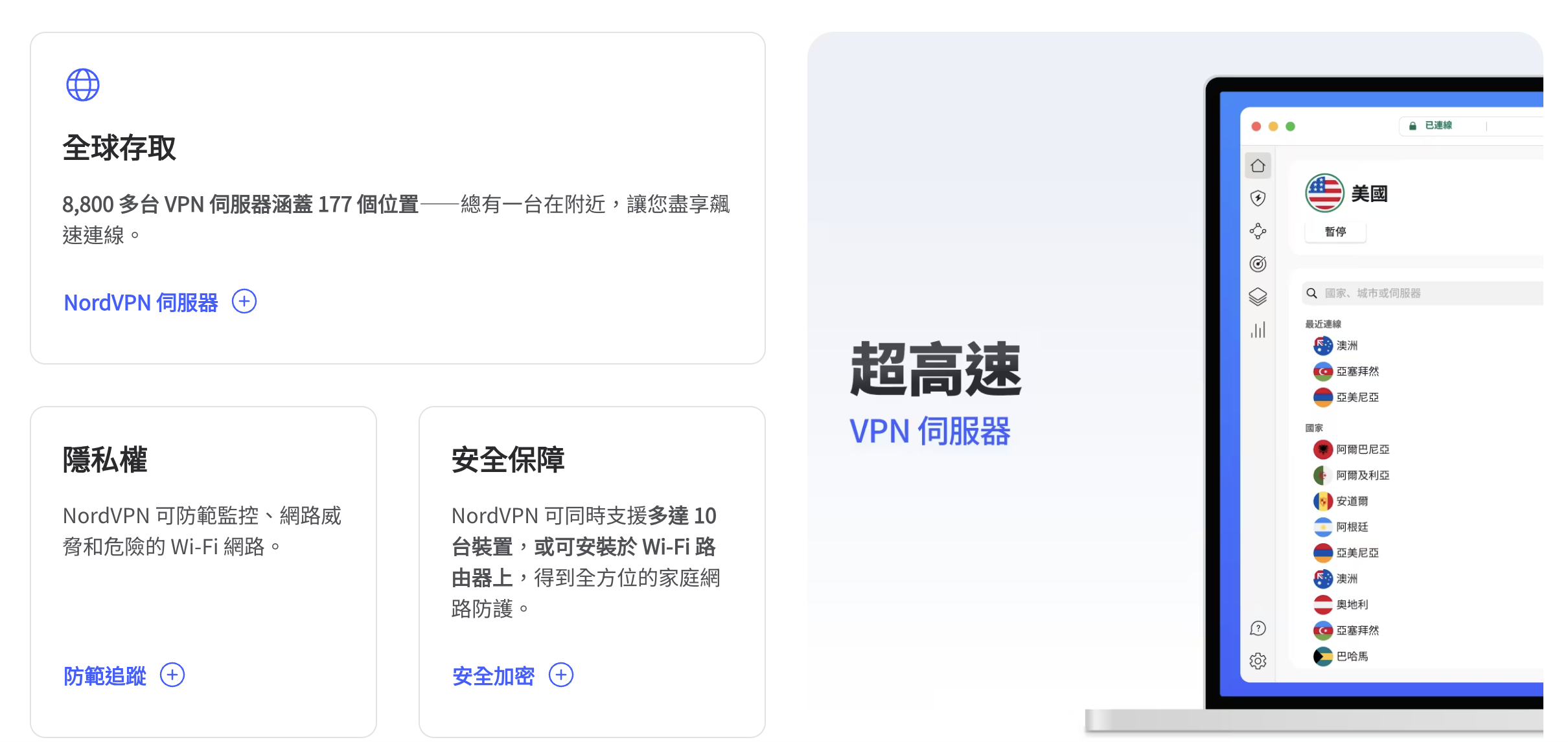 3. 伺服器:在全球擁有大量的伺服器,以便你可以獲得更好的連接速度和更多的地理位置選擇。