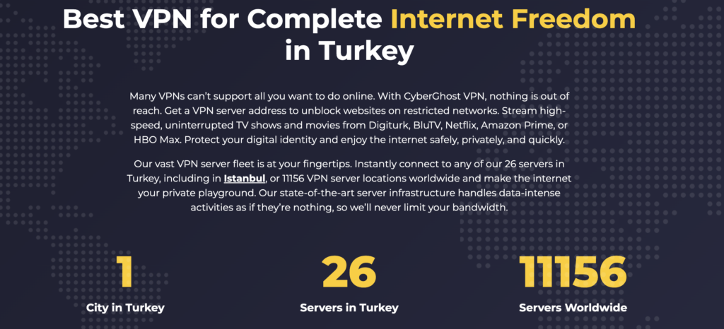 CyberGhost是另一個便宜的VPN,入門價只需HK$16,而且擁有十分多的的伺服器,在100個國家擁有11500個伺服器,其中在土耳其擁有26個伺服器,用戶可選擇其中一個以獲取土耳其IP Address。CyberGhost採用行業領先的AES-256加密,幾乎不可能被破解。此外,並擁有可靠的斷線保護功能,保護你的數據在VPN連接中斷時不會外洩。除了可靠的安全功能外,CyberGhost還可以解鎖包括Hulu、Netflix和BBC iPlayer在內的多個流媒體平台。唯需要注意的是,速度較NordVPN/ExpressVPN慢,而且沒有繁體中文介面。