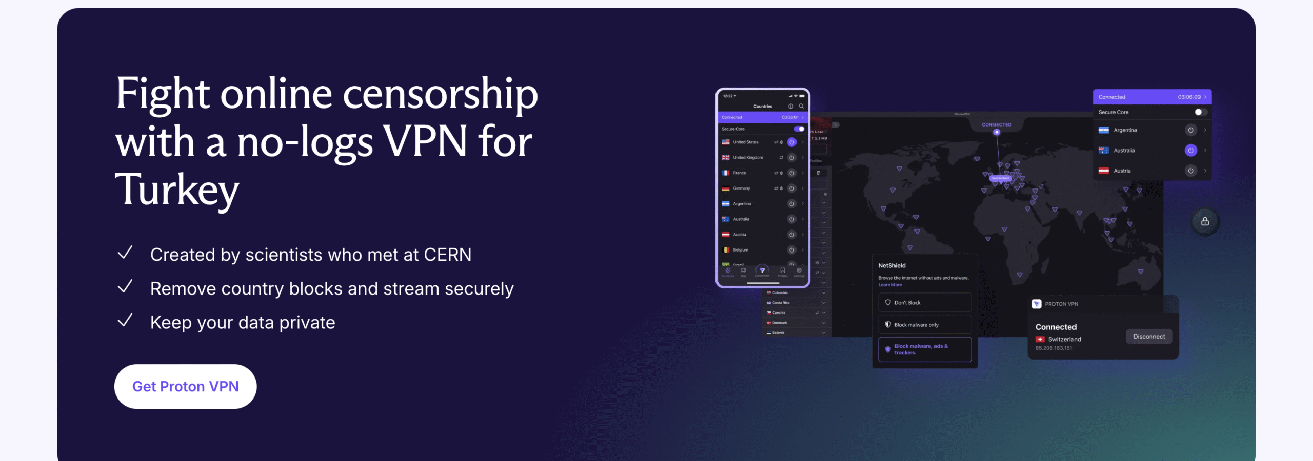 ProtonVPN是由ProtonMail團隊開發的VPN服務,該團隊以隱私保護為核心的加密電子郵件服務聞名。ProtonVPN總部位於瑞士,受到該國嚴格的隱私法規監管。他們採用透明、開源的方式運作,並且經過獨立安全專家組織Securitum的審核,確保無日誌政策的執行。這保護了用戶的隱私和數據安全。ProtonVPN在120多個國家和地區擁有超過16,000台伺服器,在土耳其擁有30多個伺服器,用戶可選擇其中一個以獲取土耳其IP地址。目前為還提供30天退款保證。ProtonVPN以其強調隱私和安全的特點,是一個受信任的VPN選擇。