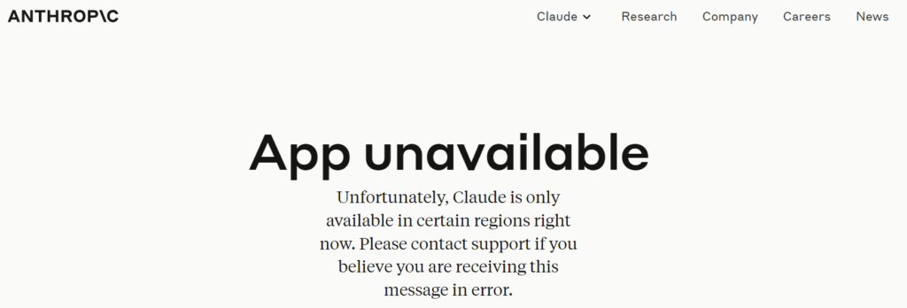 由於Claude Sonnet目前尚未在中國及香港開放,所以Claude封鎖了香港地區的IP地址,當香港用戶前往Claude官網,會出現你所在的國家目前不支援Claude (App unavailable Unfortunately, Claude is only available in certain regions right now )的錯誤。