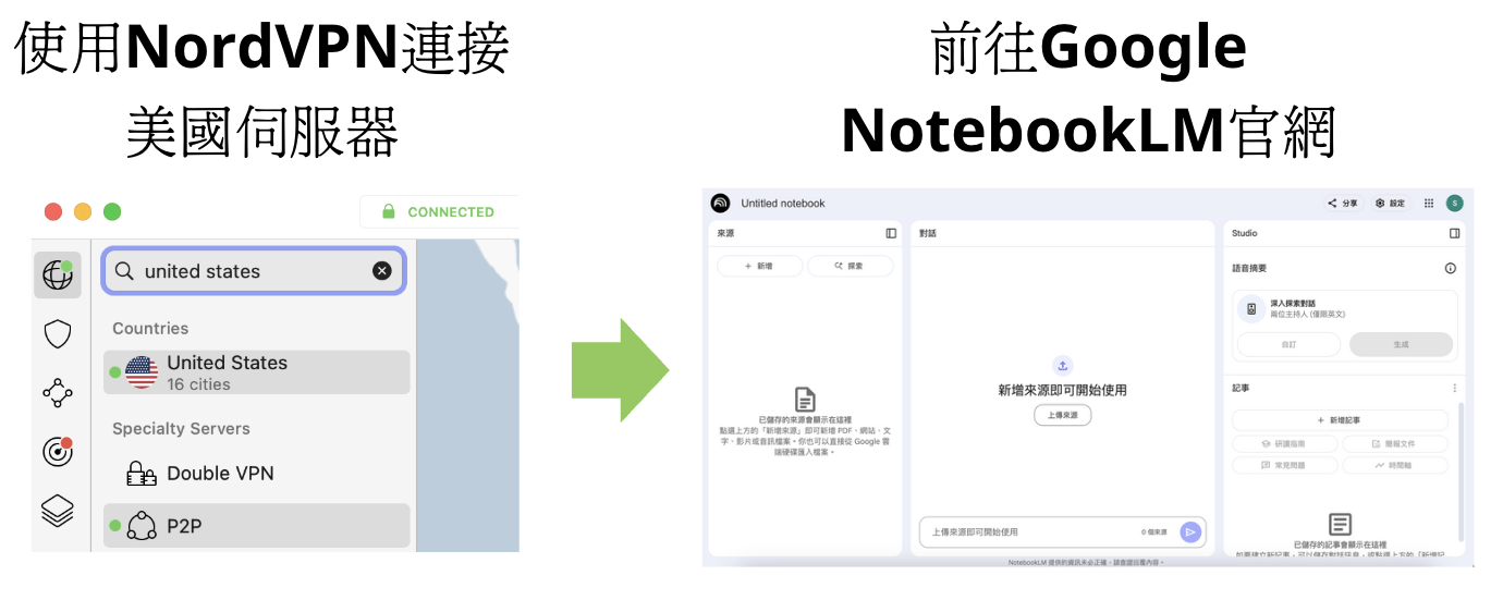 由於Google NotebookLM目前尚未在中國及香港開放,當香港用戶無法使用Google NotebookLM。解法方法很簡單,你可以透過使用虛擬專用網路(VPN),例如NordVPN、Proton VPN,連接到其他國家的伺服器,例如美國、澳洲、日本等地區,這樣便可繞過Google NotebookLM的封鎖,順利使用Google NotebookLM。