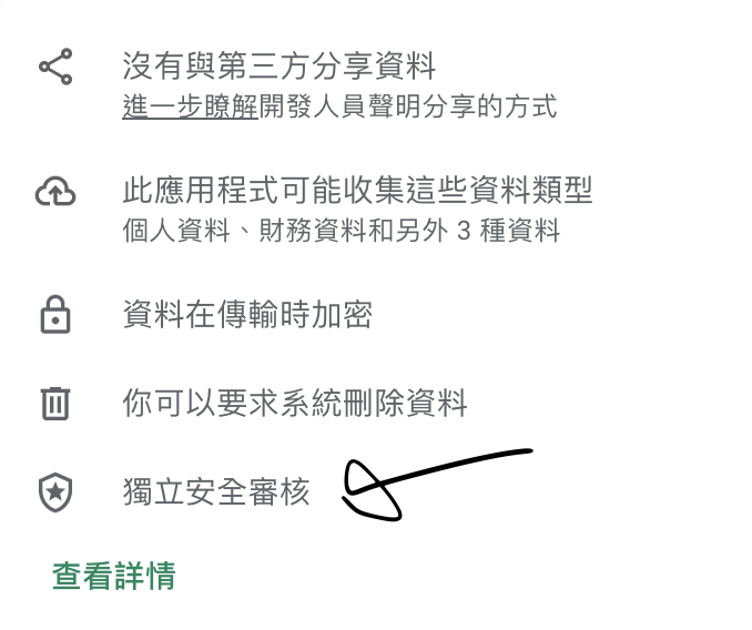 然後,在「資料安全」部分查看是否有「獨立安全審核」的徽章。如果有這個徽章,則表示該應用已經通過MASA獨立安全認證。