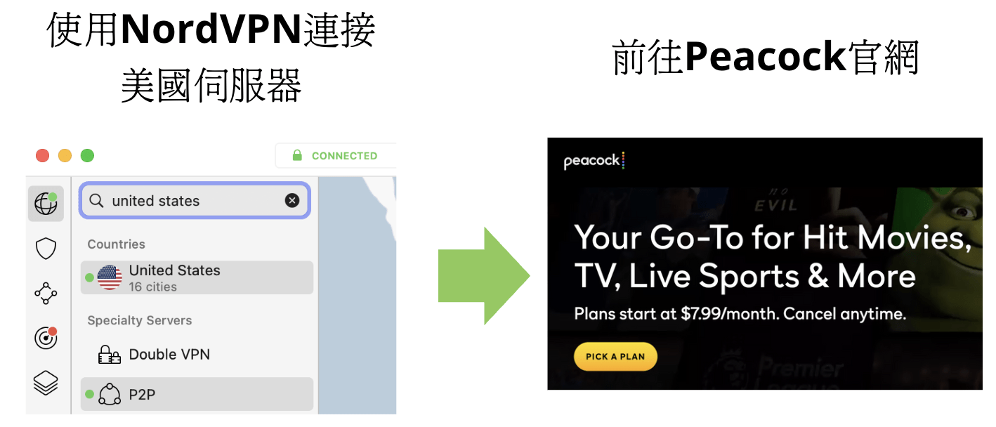 由於Peacock目前僅開放給美國地區,所以只需要使用VPN,例如NordVPNProton VPN,連接到美國地區的伺服器,便可以模擬身處於該地區,解除地區封鎖的限制。連接VPN後,前往Peacock官網,根據你的喜好,選擇訂閱計劃,訂閱後便可以觀看影片。