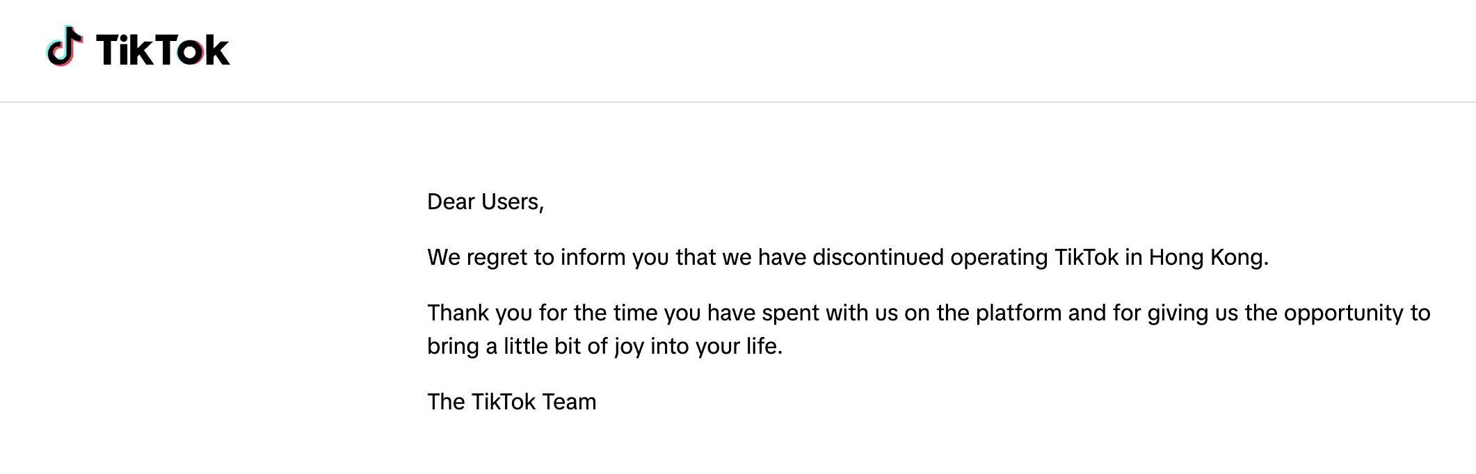 由於TikTok已在2020年宣佈撤出香港,所以香港用戶已無法使用 TikTok。當香港用戶訪問 TikTok 官方網站時,會看到業務終止的公告彈窗。TikTok 也從香港地區的應用商店下架,因此也無法在 Google Play 或 App Store 中找到。