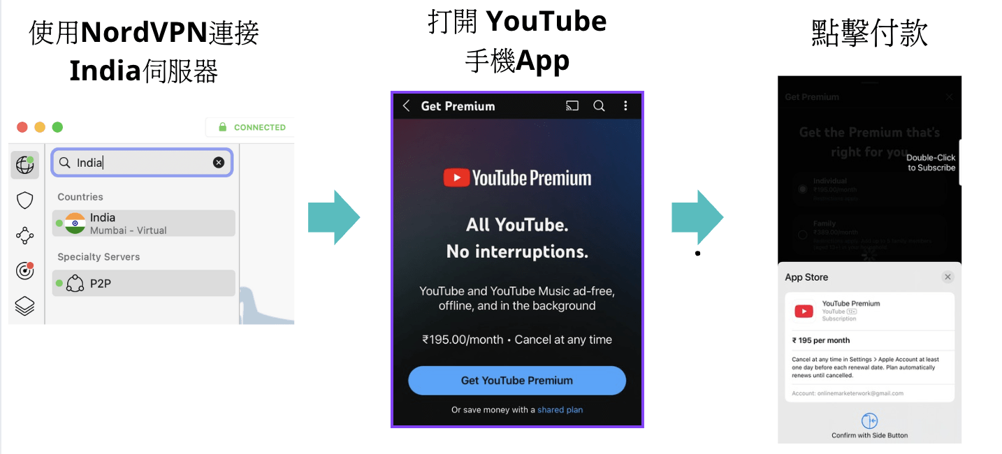 然後,打開VPN應用程式並連接至印度地區,然後打開 YouTube 手機版。進入設定,找到「購買項目和會籍」。接著,點擊「Individual」,確認印度的金額後點擊「免費試用」,即可成功付款。訂閱完成後,你無需再使用 VPN。